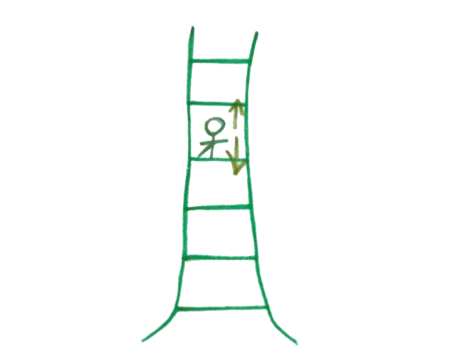 «Каждый индивид выбирает свой жизненный путь, сам себе систему координат выстраивает. Поэтому на рисунке изображен человек, который может распоряжаться своей жизнью как угодно. Так как нужно ему самому. Человечек стоит на лестнице и в любой момент может пойти в какую-нибудь сторону - хоть вверх, хоть вниз, или даже остаться на месте и чего-то ждать».